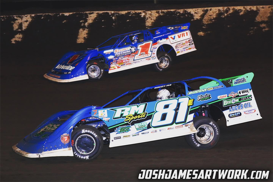 Tanner English goes wheel-to-wheel with Brandon Sheppard at Fairbury (IL) Speedway in 2021 -